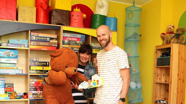 Am 17. Mai kam der Geschäftsführer der Fitness am Brühl GmbH Leipzig, Christian Möslein, mit seinem Kollegen Christian Winkler ins Kinderhospiz, um sportliche 745 Euro zu übergeben. Außerdem brachten sie eine gut bestückte Spendendose mit, die die Mitglieder der Fitnessstudios mit 249,27 Euro gefüllt hatten.