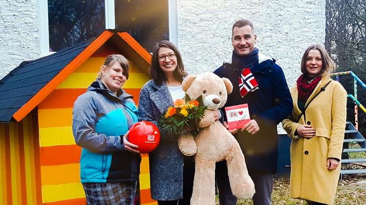 Sagenhafte 1.610 EUR konnten durch die Spendentombola und einen weiteren Kuchenbasar gesammelt werden. Oliver Wittki, Leiter Vermietung Regionalbereich Südost, sowie Christiane Eisenreich von der DB Station und Service AG und Johanna Angermann von der DB Immobilien Region Südost Deutsche Bahn AG übergaben nun das gesammelte Geld persönlich im Kinderhospiz Bärenherz.