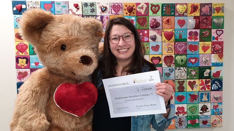 „Hallo hier ist Hydro Extrusion Rackwitz, wir haben wieder etwas gesammelt“, so die frohe Nachricht Ende Januar. „Wieder etwas gesammelt“ ist dabei überaus bescheiden formuliert. Denn die 250 Mitarbeiter und Mitarbeiterinnen des Aluminiumstrangpresswerkes im Norden von Leipzig waren bereits mehrfach ganz aktiv beim Spendensammeln für das Kinderhospiz Bärenherz unterwegs. Zunächst fand die jährliche Tombola statt, bei der die Belegschaft Lose erwerben konnte und ein Preis zu gewinnen war. Diese Aktion erbrachte bereits die hohe Summe von 3.350 Euro. Doch damit nicht genug. Die Geschäftsführung verdoppelte diesen Betrag nicht nur, sondern rundete ihn auch nach oben auf, auf gesamt 7.000 Euro. Dazu kamen noch 2.200 Euro, Spendengelder die im vergangen Jahr aus diversen internen Verkäufen an die Mitarbeitenden eingenommen wurden. Daraus ergibt sich die stolze Gesamtsumme von 9.200 Euro.