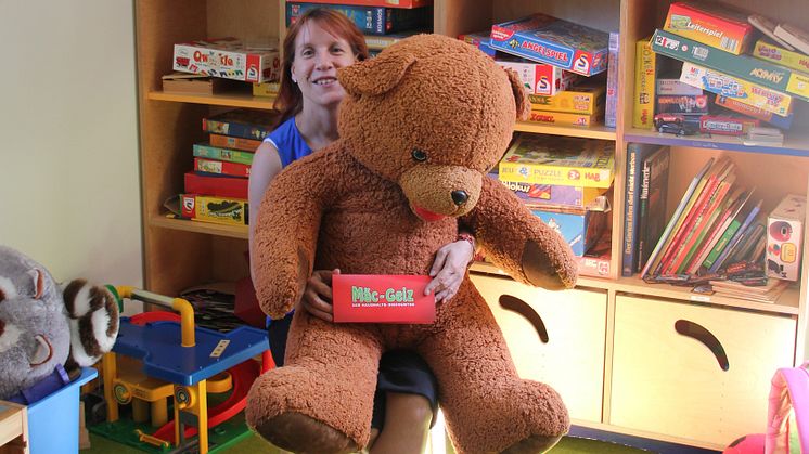 Nicht zum ersten Mal hat die Mäc Geiz Handelsgesellschaft mbH dem Kinderhospiz eine großzügige Spende zukommen lassen. Mit 1.000 Euro und einer Spielesammlung kam Ivonne Schänzer von Mäc Geiz ins Kinderhospiz, um die Spende persönlich zu übergeben. Kerstin Stadler, Mitarbeiterin des Fördervereins, berichtet ihr von der Arbeit, die Bärenherz für Familien mit unheilbar kranken Kindern macht, und führte sie durch die neuen Räume. Im Toberaum für die Geschwisterkinder entstand der Schnappschuss mit Paul, dem Bären. Wir sagen Danke und freuen uns sehr über die erneute riesige Unterstützung!