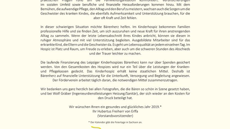 Mit dem Kalender möchte der Verein Kinderhospiz Bärenherz Leipzig e.V. die Öffentlichkeit auf das Kinderhospiz Bärenherz aufmerksam machen, außerdem darüber informieren, dass von den Gesamtkosten des Hospizes nur ein Teil über die Leistungen der Kranken- und Pflegekassen gedeckt werden, so dass Bärenherz auf finanzielle Unterstützung für Unterkunft, Versorgung und Begleitung der Familien angewiesen ist. Der Förderverein arbeitet täglich daran, die notwendigen Mittel zusammenzutragen.