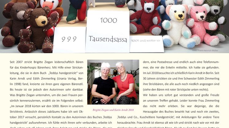 Seit 2007 strickt Brigitte Ziegan leidenschaftlich Bären für das Kinderhospiz Bärenherz. Inzwischen sind weit über 1.000 Bären entstanden und es kribbelt ihr immer noch in den Fingern.