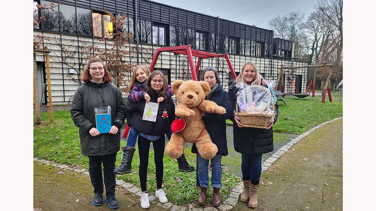 Zur Spendenübergabe machten sich die Schulsprecherin Leonie, 9. Klasse, mit Maxi, Klasse 3, Stella aus der 7. Klasse sowie Frau Graich auf den Weg zu uns nach Markkleeberg. Und sie brachten nicht nur das gesammelte Geld mit, sondern auch liebevoll gestaltete Weihnachtskarten und einen großen Präsentkorb für das Bärenherz-Team.