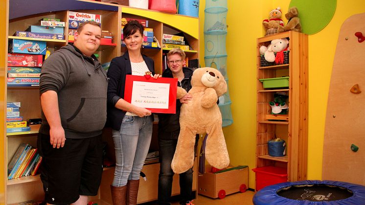 Norman Eilert (Azubi), Josephine Hermanns (Pflegepädagogin) und Sophie Lathan (Azubi) mit Spendenscheck im Geschwisterzimmer des Kinderhospizes