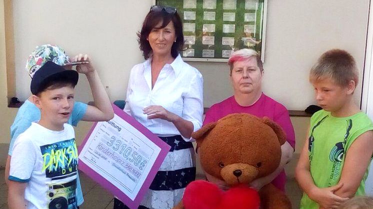 Am 23. Juni erfolgte die Scheckübergabe in der Grundschule in Prausitz.Voller Stolz überreichte Lukas den Scheck an Constanze Weiß vom Bärenherz.
