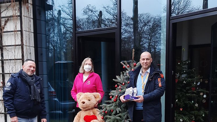 André Jahnke und Thorsten Wilke mit Elvira Wegner von Bärenherz vorm Kinderhospiz