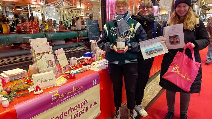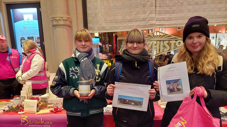 Die Abschlussklassen 10a und 10b des Jahrganges 2022/23 der Oberschule Naunhof spendeten einen Teil ihrer Klassenkasse und einen Teil der für ihre Abschlussfeier gesammelten Gelder. Drei Vertreterinnen der beiden zehnten Klassen machten sich anschließend auf den Weg, um uns die Spende persönlich vorbei zu bringen. Die Spendenübergabe fand Anfang Dezember in der Mädler-Passage statt, an unserem traditionellen Bärenherz-Weihnachtsstand in der Leipziger Innenstadt. Danke liebe Oberschule Naunhof und Danke liebe engagierte Schülerschaft für diese Unterstützung unserer Bärenherz-Kinder und ihrer Familien.