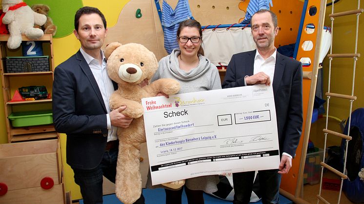 Auch in diesem Jahr verzichtete die Agentur AlpinProtect - Versicherungskonzepte für Höhenarbeiter darauf, an ihre Kunden Weihnachtspost zu schicken. Stattdessen spendete sie erneut dem Kinderhospiz Bärenherz. Am 18. Dezember kam Geschäftsführer Bernd Bandhauer mit seinem Kollegen Ronald Teske ins Kinderhospiz, um einen Scheck in der Höhe von 1.500 Euro zu übergeben.
