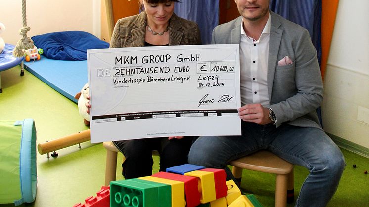 Einen Spendenscheck über 10.000 Euro hat Marko Lotz, Chef der Leipziger MKM Group GmbH, jetzt dem Kinderhospiz Bärenherz abgegeben. Die runde Summe kam zum zehnjährigen Bestehen seines Unternehmens zusammen.