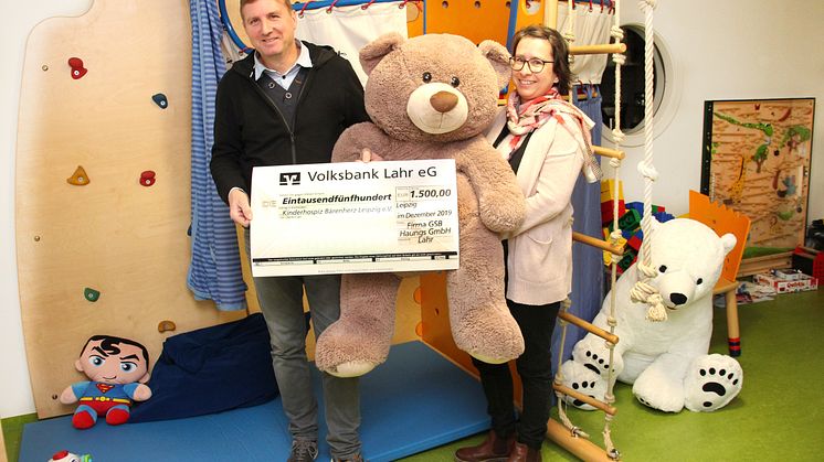 DieGSB Haungs GmbH unterstützt bereits seit 2016 das Kinderhospiz Bärenherz Leipzig. Jedes Jahr erhält Bärenherz eine Weihnachtsspende in der Höhe von 1.500 Euro, die immer vom Betriebsleiter der GSB Haungs GmbH, Michael Schmelzle, persönlich im Kinderhospiz übergeben wird.