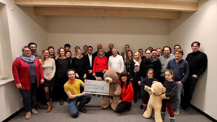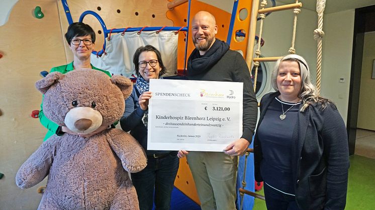 Eine Spende von 3.121 Euro für das Leipziger Kinderhospiz Bärenherz sammelten die Rackwitzer Mitarbeiter*innen der Firma Hydro Extrusion. Bei einer Tombola kamen zunächst 1.560,50 Euro zusammen. Im Anschluss verdoppelte die Rackwitzer Geschäftsleitung den Betrag.