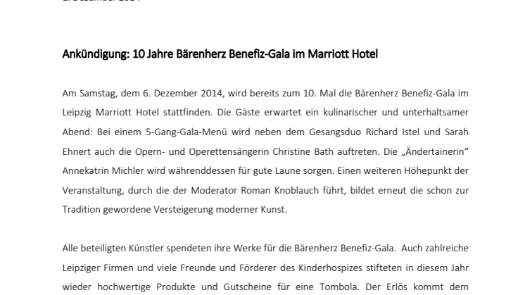 Am Samstag, dem 6. Dezember 2014, wird bereits zum 10. Mal die Bärenherz Benefiz-Gala im Leipzig Marriott Hotel stattfinden. Die Gäste erwartet ein kulinarischer und unterhaltsamer Abend: Bei einem 5-Gang-Gala-Menü wird neben dem Gesangsduo Richard Istel und Sarah Ehnert auch die Opern- und Operettensängerin Christine Bath auftreten. Die „Ändertainerin“ Annekatrin Michler wird währenddessen für gute Laune sorgen. Einen weiteren Höhepunkt der Veranstaltung, durch die der Moderator Roman Knoblauch führt, bildet erneut die schon zur Tradition gewordene Versteigerung moderner Kunst.