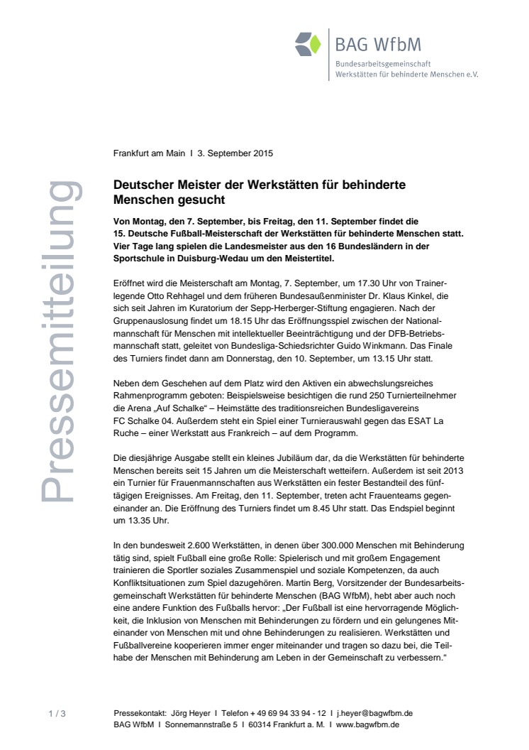 Von Montag, den 7. September, bis Freitag, den 11. September findet die 15. Deutsche Fußball-Meisterschaft der Werkstätten für behinderte Menschen statt. Vier Tage lang spielen die Landesmeister aus den 16 Bundesländern in der Sportschule in Duisburg-Wedau um den Meistertitel.