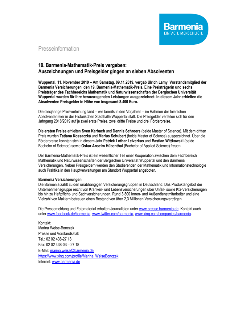 Am Samstag, 09.11.2019, vergab Ulrich Lamy, Vorstandsmitglied der Barmenia Versicherungen, den 19. Barmenia-Mathematik-Preis. Eine Preisträgerin und sechs Preisträger des Fachbereichs Mathematik und Naturwissenschaften der Bergischen Universität Wuppertal wurden für ihre herausragenden Leistungen ausgezeichnet.