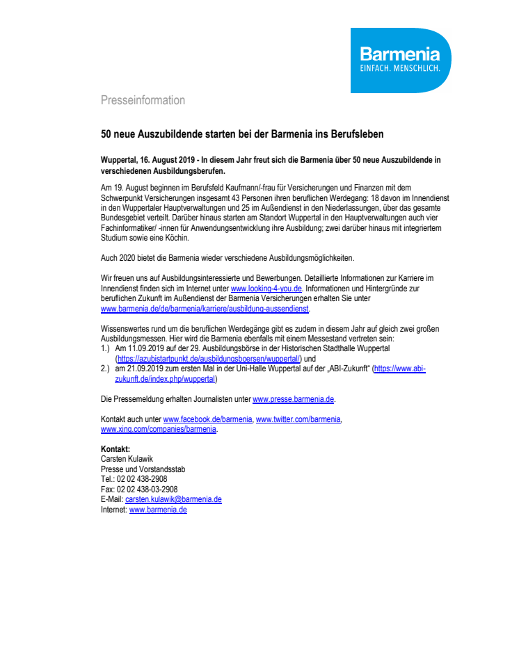 In diesem Jahr freut sich die Barmenia über 50 neue Auszubildende in verschiedenen Ausbildungsberufen.