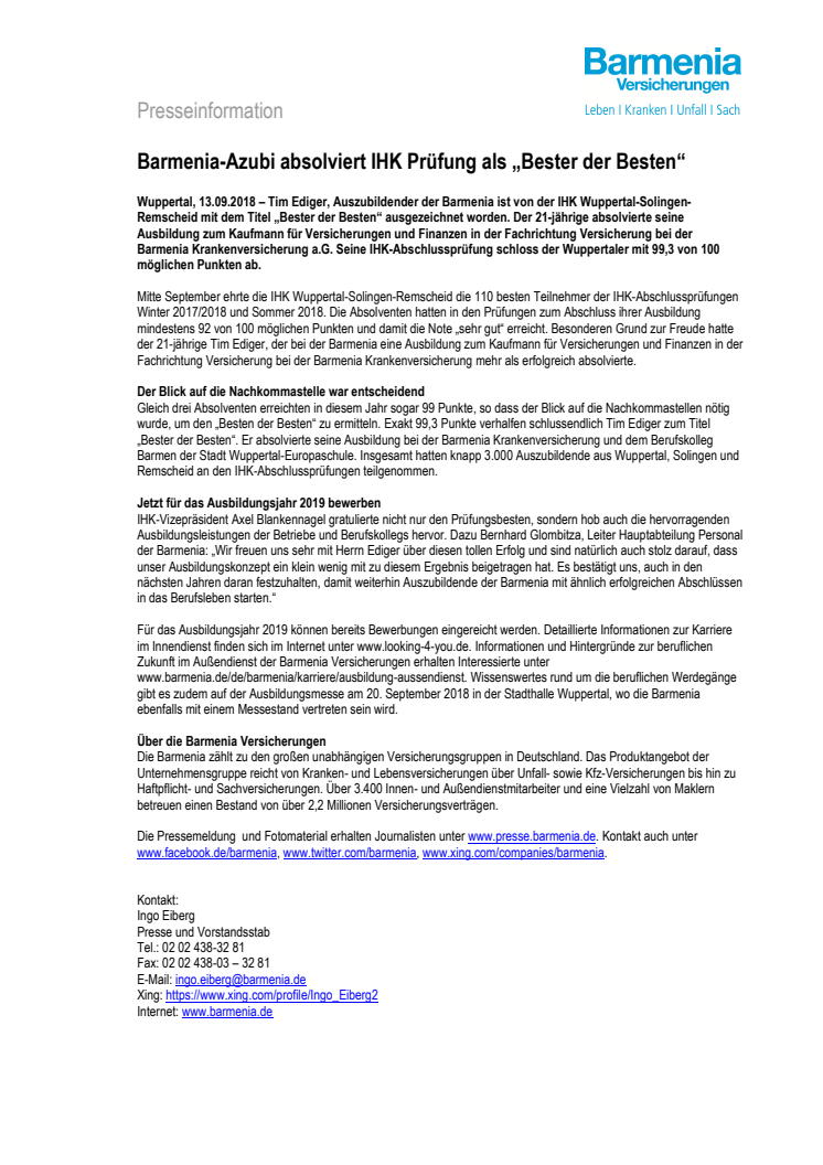 Tim Ediger, Auszubildender der Barmenia ist von der IHK Wuppertal-Solingen-Remscheid mit dem Titel „Bester der Besten“ ausgezeichnet worden. Der 21-jährige absolvierte seine Ausbildung zum Kaufmann für Versicherungen und Finanzen in der Fachrichtung Versicherung bei der Barmenia Krankenversicherung a.G. Seine IHK-Abschlussprüfung schloss der Wuppertaler mit 99,3 von 100 möglichen Punkten ab.
