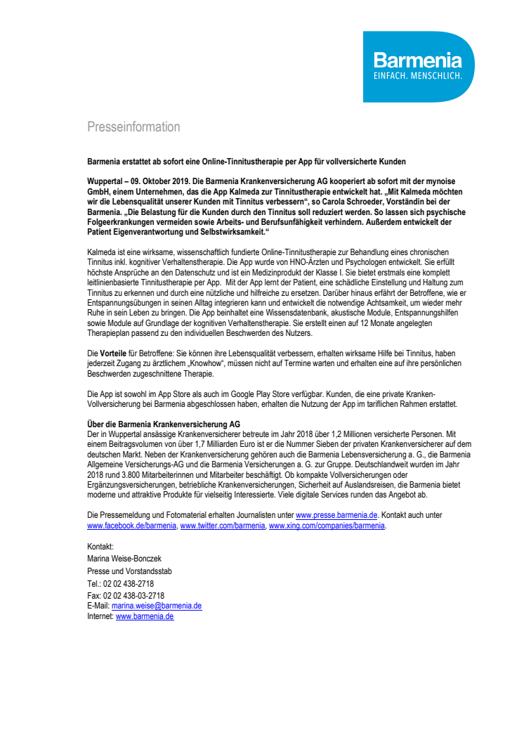 Die Barmenia Krankenversicherung AG kooperiert ab sofort mit der mynoise GmbH, einem Unternehmen, das die App Kalmeda zur Tinnitustherapie entwickelt hat.