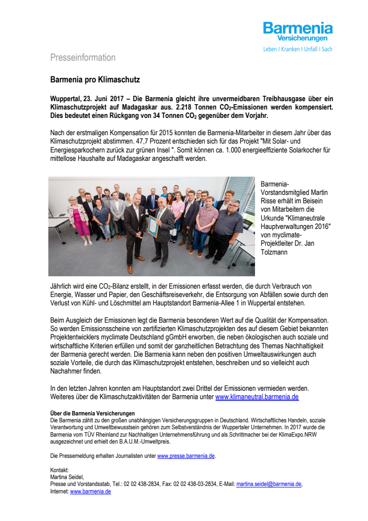 Die Barmenia gleicht ihre unvermeidbaren Treibhausgase über ein Klimaschutzprojekt auf Madagaskar aus. 2.218 Tonnen CO2-Emissionen werden kompensiert. Dies bedeutet einen Rückgang von 34 Tonnen CO2 gegenüber dem Vorjahr.