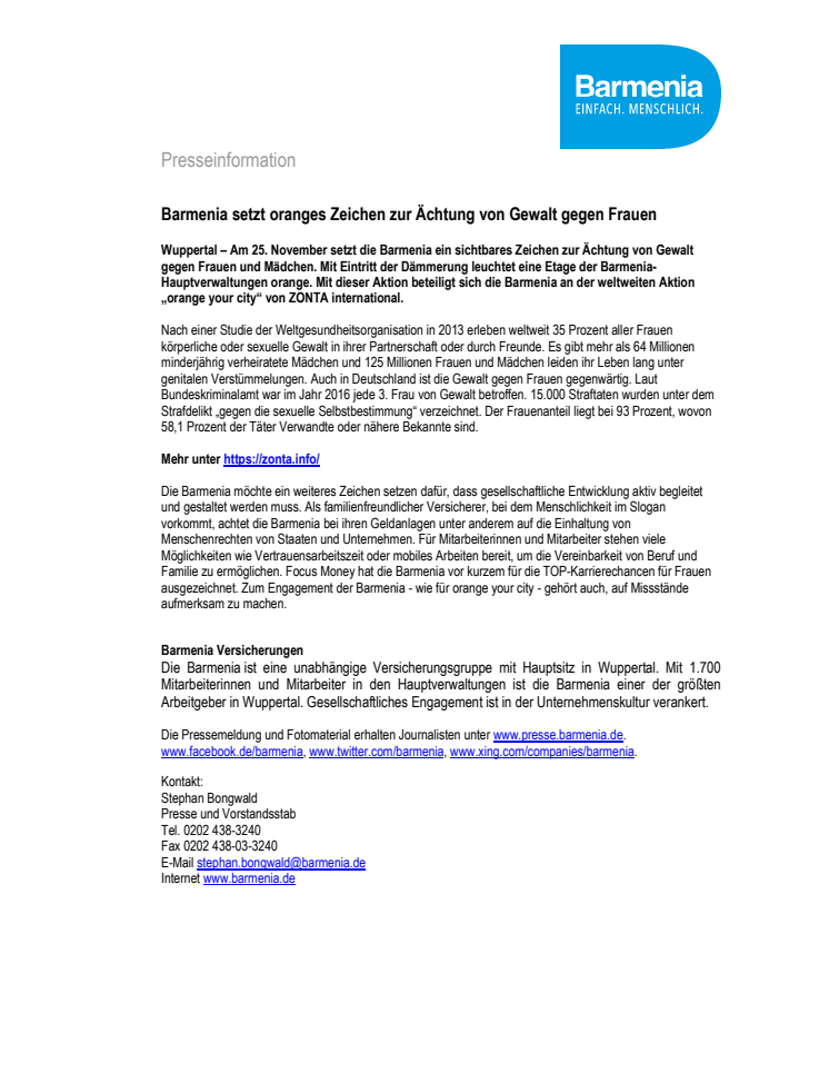 Barmenia setzt oranges Zeichen zur Ächtung von Gewalt gegen Frauen