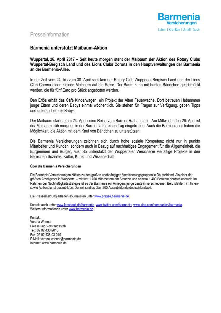 Seit heute morgen steht der Maibaum der Aktion des Rotary Clubs Wuppertal-Bergisch Land und des Lions Clubs Corona in den Hauptverwaltungen der Barmenia an der Barmenia-Allee.