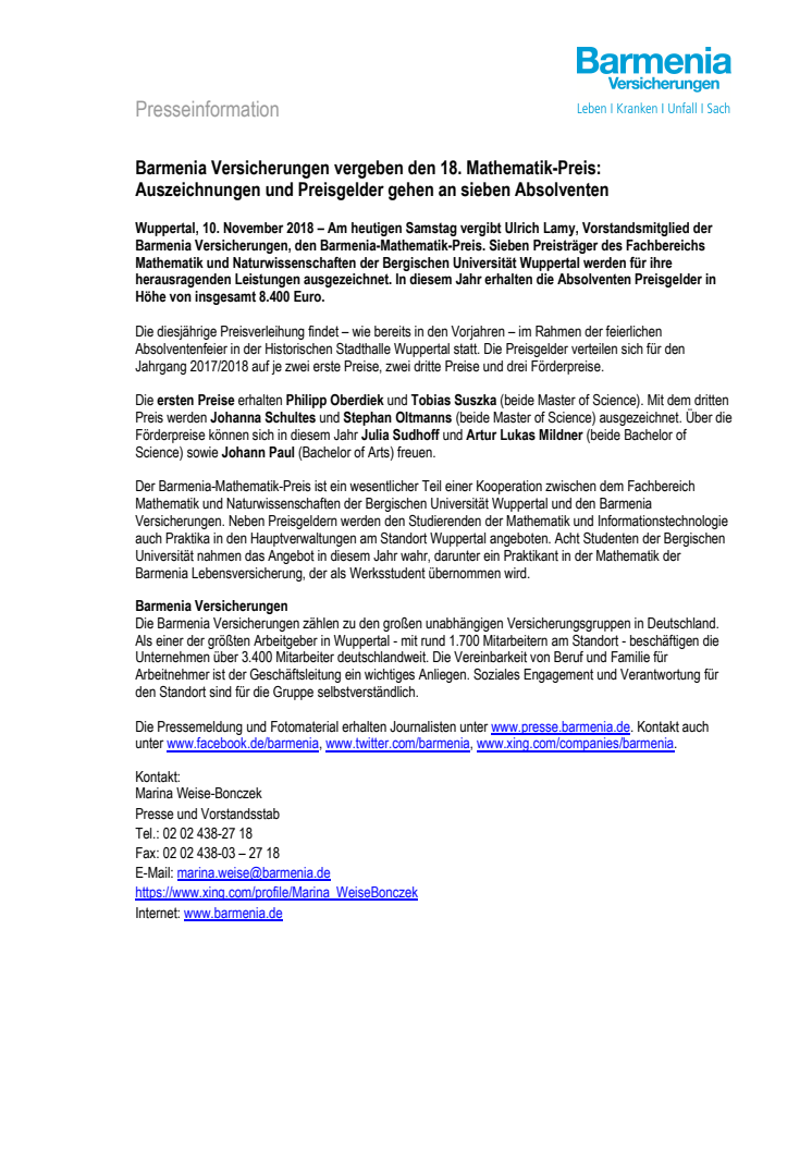 Am Samstag, den 10. November 2018, vergab Ulrich Lamy, Vorstandsmitglied der Barmenia Versicherungen, den Barmenia-Mathematik-Preis. Sieben Preisträger des Fachbereichs Mathematik und Naturwissenschaften der Bergischen Universität Wuppertal wurden für ihre herausragenden Leistungen ausgezeichnet. In diesem Jahr erhielten die Absolventen Preisgelder in Höhe von insgesamt 8.400 Euro.