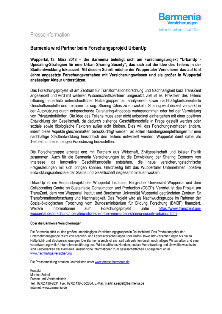 Die Barmenia beteiligt sich am Forschungsprojekt "UrbanUp - Upscaling-Strategien für eine Urban Sharing Society", das sich auf die Idee des Teilens in der Stadtentwicklung fokussiert. Mit diesem Schritt möchte der Wuppertaler Versicherer das auf fünf Jahre angesetzte Forschungsvorhaben mit Versicherungswissen und als großer in Wuppertal ansässiger Akteur unterstützen.