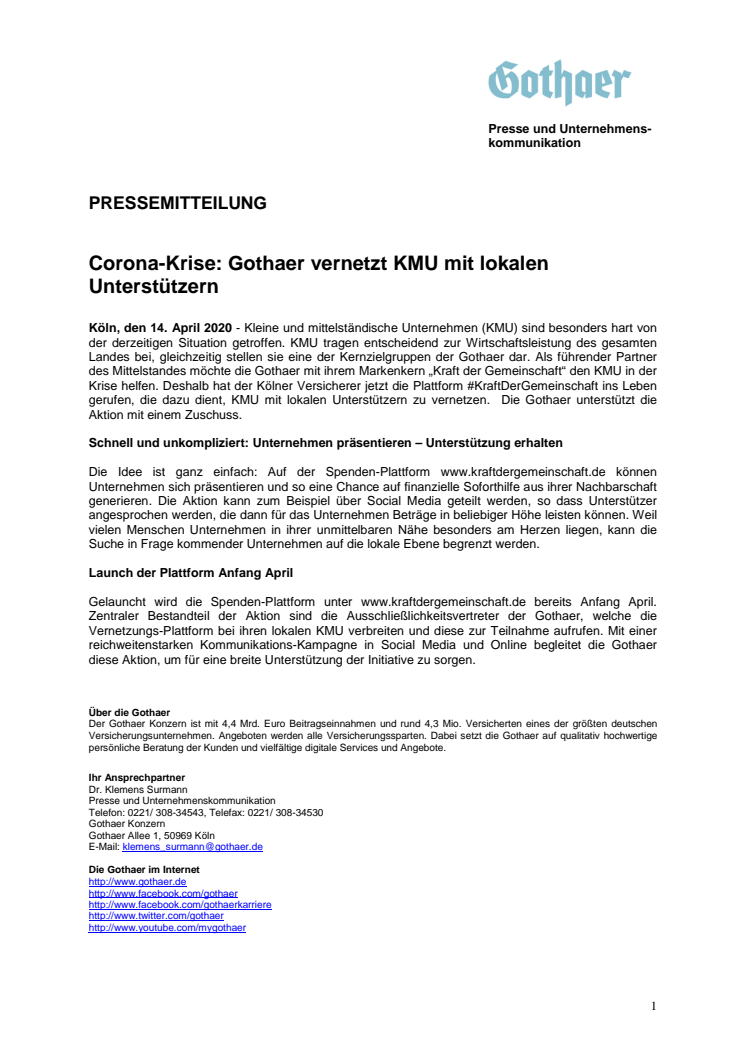 Kleine und mittelständische Unternehmen (KMU) sind besonders hart von der derzeitigen Situation getroffen. Deshalb hat der Kölner Versicherer jetzt die Plattform #KraftDerGemeinschaft ins Leben gerufen, die dazu dient, KMU mit lokalen Unterstützern zu vernetzen. Die Gothaer unterstützt die Aktion mit einem Zuschuss.