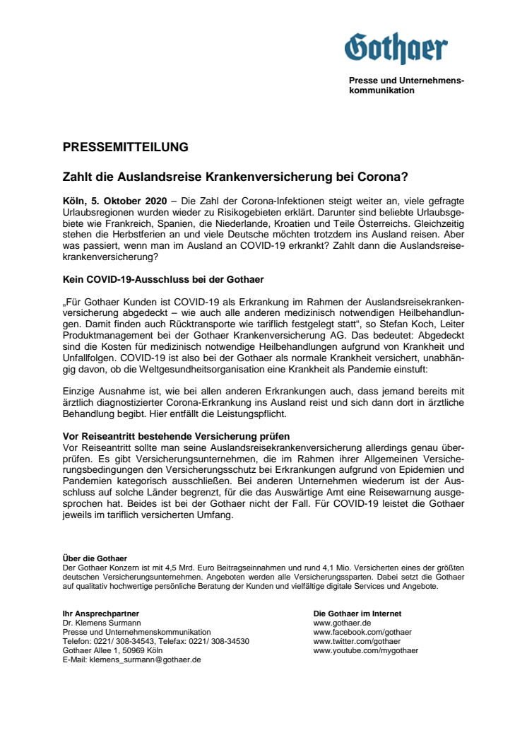 Die Zahl der Corona-Infektionen steigt weiter an, viele gefragte Urlaubsregionen wurden wieder zu Risikogebieten erklärt. Viele Deutsche möchten trotzdem ins Ausland reisen. Aber was passiert, wenn man im Ausland an COVID-19 erkrankt? Zahlt dann die Auslandsreisekrankenversicherung?