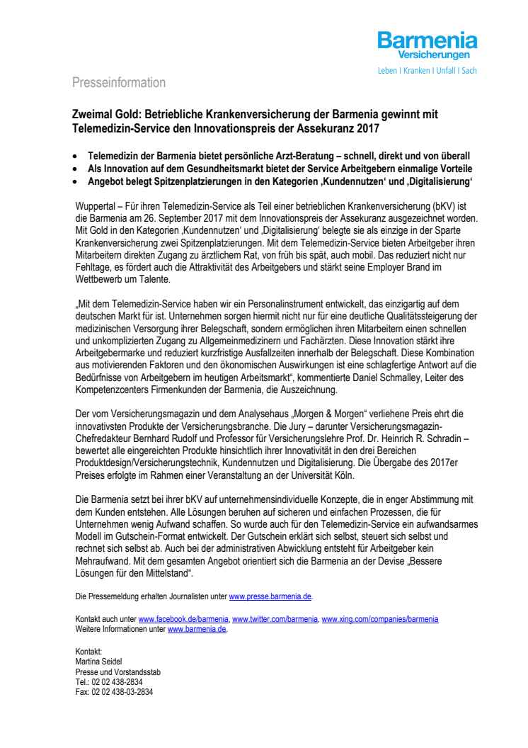 Zweimal Gold: Betriebliche Krankenversicherung der Barmenia gewinnt mit Telemedizin-Service den Innovationspreis der Assekuranz 2017