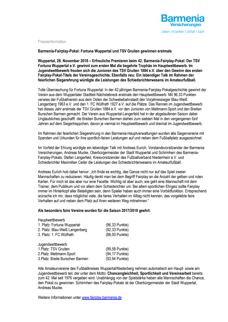 Tolle Überraschung für Fortuna Wuppertal: In der 42-jährigen Barmenia-Fairplay-Pokalgeschichte gewinnt der Verein aus dem Wuppertaler Stadtteil Nächstebreck erstmals den Hauptwettbewerb. Mit 96,33 Punkten verwies der Fußballverein aus dem Osten der Schwebebahnstadt den Vorjahressieger Blau-Weiß Langenberg 1963 e.V. und den 1. FC Wülfrath 1927 e.V. auf die Plätze. Das Rennen im Jugendwettbewerb hat dieses Jahr erstmals der TSV Gruiten 1884 e.V. vor den Junioren von Mettmann-Sport und den Breiten Burschen Barmen gemacht. Der Verein aus Wuppertal-Langerfeld hat in der abgelaufenen Saison dabei Unglaubliches geschafft: die Breiten Burschen Barmen stehen zum siebten Mal in den vergangenen fünf Jahren auf dem Siegertreppchen, davon je viermal im Hauptwettbewerb und dreimal im Jugendwettbewerb.