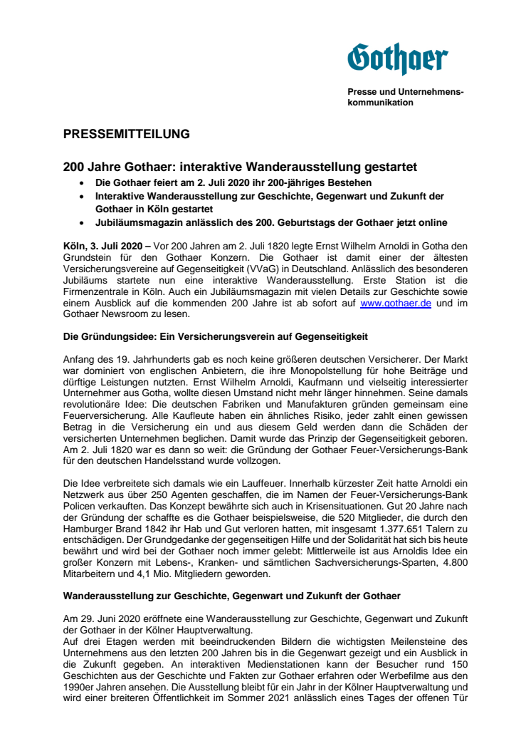 Köln, 3. Juli 2020 – Vor 200 Jahren am 2. Juli 1820 legte Ernst Wilhelm Arnoldi in Gotha den Grundstein für den Gothaer Konzern. Die Gothaer ist damit einer der ältesten Versicherungsvereine auf Gegenseitigkeit (VVaG) in Deutschland. Anlässlich des besonderen Jubiläums startete nun eine interaktive Wanderausstellung. Erste Station ist die Firmenzentrale in Köln. Auch ein Jubiläumsmagazin mit vielen Details zur Geschichte sowie einem Ausblick auf die kommenden 200 Jahre ist ab sofort auf www.gothaer.de und im Gothaer Newsroom zu lesen.