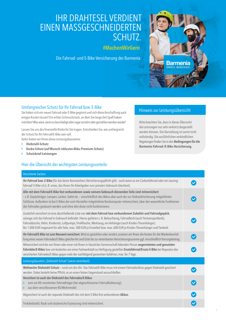 „Die Barmenia bietet Fahrradbesitzerinnen und -besitzern einen beliebten Rundumschutz“, sagt Maurice Rosenecker, Leiter Produktmanagement und Underwriting im Segment Komposit bei der Barmenia. „Dieser setzt sich aus dem Diebstahl- sowie Kasko-Schutz und dem Schutzbrief zusammen. Wer möchte, kann den Schutzbrief auch abwählen. So erhalten Kundinnen und Kunden den individuellen Schutz, den sie für ihr Fahrrad brauchen. Mit dem neuen Tarif haben wir die einzelnen Leistungsbausteine weiter verbessert.“