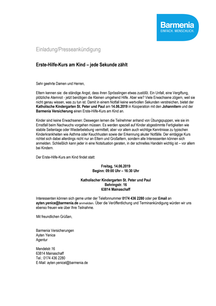 Interessenten können sich gerne unter der Telefonnummer 0174 436 2280oder per Email an ayten.yenice@barmenia.de anmelden. Über die Veröffentlichung und Terminankündigung würden wir uns ebenso freuen wie über Ihre Teilnahme.