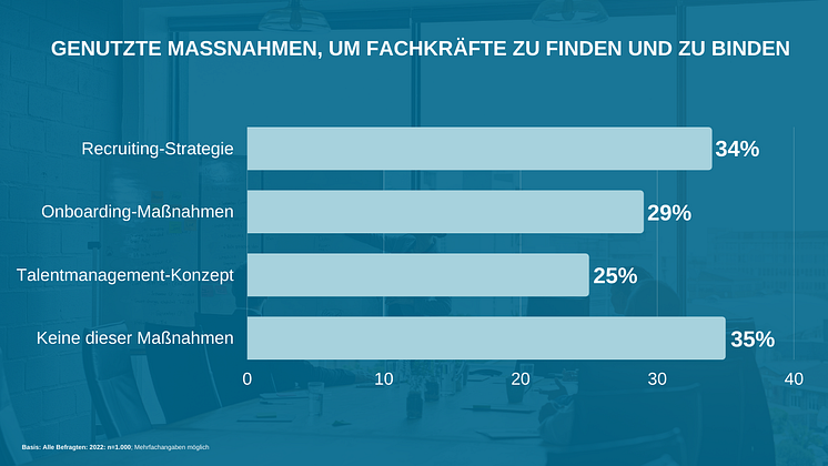 Was die systematische Umsetzung verschiedener HR-Maßnahmen betrifft, haben KMU noch Luft nach oben. 34 Prozent geben an über eine Recruiting-Strategie zu verfügen. 29 Prozent der Unternehmen setzen auf ein strukturiertes Onboarding neuer Mitarbeitender. Ein Talentmanagement-Konzept – also das Identifizieren, Halten und Entwickeln von qualifizierten Fachkräften – findet in 25 Prozent der Unternehmen Anwendung. 35 Prozent setzen keine der genannten Maßnahmen um. Auch hier auffällig: Je größer das Unternehmen, desto häufiger werden die Maßnahmen umgesetzt.