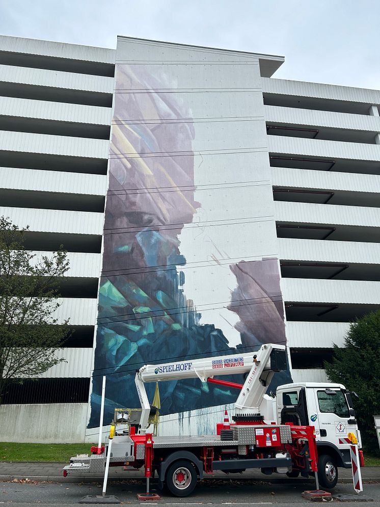 Seit letzter Woche malt die aus Brüssel stammende Künstlerin Elisa Morlet (*1991), die unter dem Namen Iota kreativ ist, ein großes Wandbild (sog. Mural) an die Fassade des Parkhauses der BarmeniaGothaer Versicherungen an der Ronsdorfer Straße.