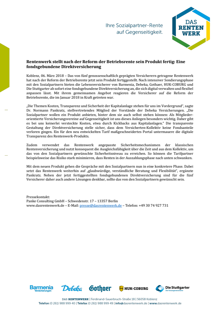 Das von fünf genossenschaftlich geprägten Versicherern getragene Rentenwerk hat nach der Reform der Betriebsrente jetzt sein Produkt fertiggestellt. Nach intensiver Sondierungsphase mit den Sozialpartnern bieten die Lebensversicherer von Barmenia, Debeka, Gothaer, HUK-COBURG und Die Stuttgarter ab sofort eine fondsgebundene Direktversicherung an, die sich digital verwalten und flexibel anpassen lässt. Mit ihrem gemeinsamen Angebot reagieren die Versicherer auf die Reform der Betriebsrente, die im Januar 2018 in Kraft getreten war.