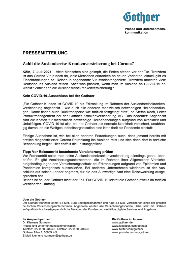 „Für Gothaer Kunden ist COVID-19 als Erkrankung im Rahmen der Auslandsreisekrankenversicherung abgedeckt – wie auch alle anderen medizinisch notwendigen Heilbehandlungen. Damit finden auch Rücktransporte wie tariflich festgelegt statt“, so Stefan Koch, Leiter Produktmanagement bei der Gothaer Krankenversicherung AG. Das bedeutet: Abgedeckt sind die Kosten für medizinisch notwendige Heilbehandlungen aufgrund von Krankheit und Unfallfolgen. COVID-19 ist also bei der Gothaer als normale Krankheit versichert, unabhängig davon, ob die Weltgesundheitsorganisation eine Krankheit als Pandemie einstuft: