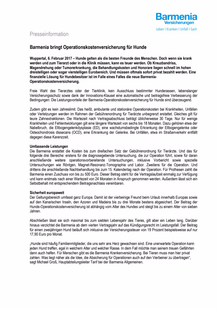 • Barmenia bringt Operationskostenversicherung für Hunde