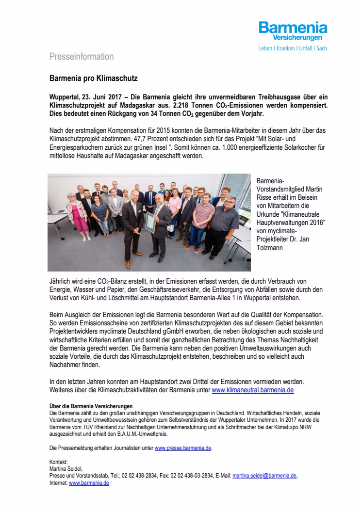 • Barmenia-Urkunde "Klimaneutrale Hauptverwaltungen 2016" von myclimate