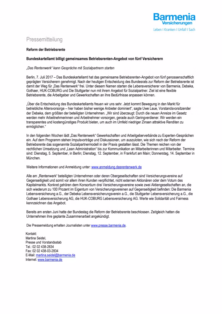 • Reform der Betriebsrente : Bundeskartellamt billigt gemeinsames Betriebsrenten-Angebot von fünf Versicherern