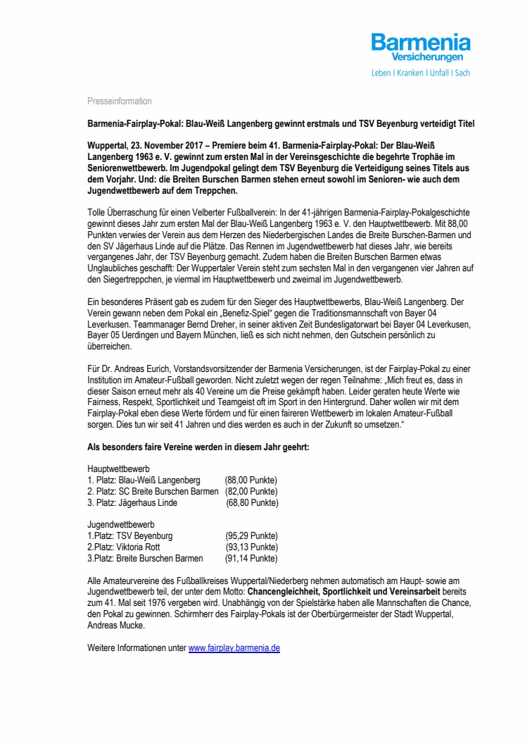 • Barmenia-Fairplay-Pokal: Blau-Weiß Langenberg gewinnt erstmals und TSV Beyenburg verteidigt Titel
