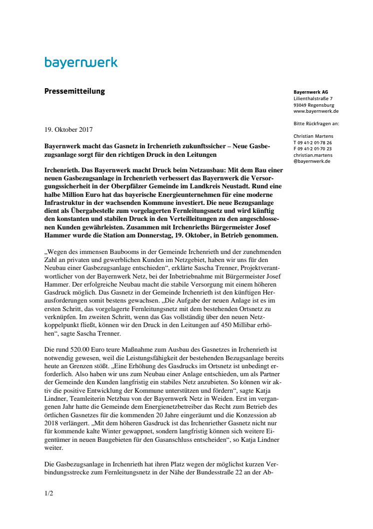Das Bayernwerk macht Druck beim Netzausbau: Mit dem Bau einer neuen Gasbezugsanlage in Irchenrieth verbessert das Bayernwerk die Versorgungssicherheit in der Oberpfälzer Gemeinde im Landkreis Neustadt. Rund eine halbe Million Euro hat das Energieunternehmen für eine moderne Infrastruktur in der wachsenden Kommune investiert. Am Donnerstag, 19.10., ist die Anlage in Betrieb genommen worden.