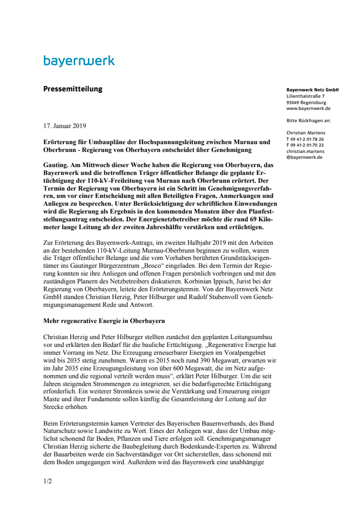 Gauting. Am Mittwoch, 15. Januar, haben die Regierung von Oberbayern, das Bayernwerk und die betroffenen Träger öffentlicher Belange die geplante Ertüchtigung der 110-kV-Freileitung von Murnau nach Oberbrunn erörtert. Der Termin der Regierung von Oberbayern ist ein Schritt im Genehmigungs-verfahren, um vor einer Entscheidung mit allen Beteiligten Fragen, Anmerkungen und Anliegen zu besprechen.