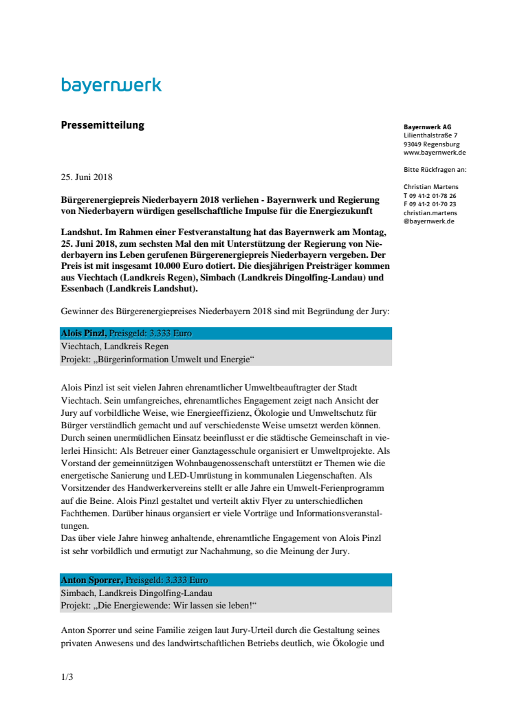 Landshut. Im Rahmen einer Festveranstaltung hat das Bayernwerk am Montag, 25. Juni 2018, zum sechsten Mal den mit Unterstützung der Regierung von Niederbayern ins Leben gerufenen Bürgerenergiepreis Niederbayern vergeben. Der Preis ist mit insgesamt 10.000 Euro dotiert. Die diesjährigen Preisträger kommen aus Viechtach (Lk Regen), Simbach (Lk Dingolfing-Landau) und Essenbach (Lk Landshut).
