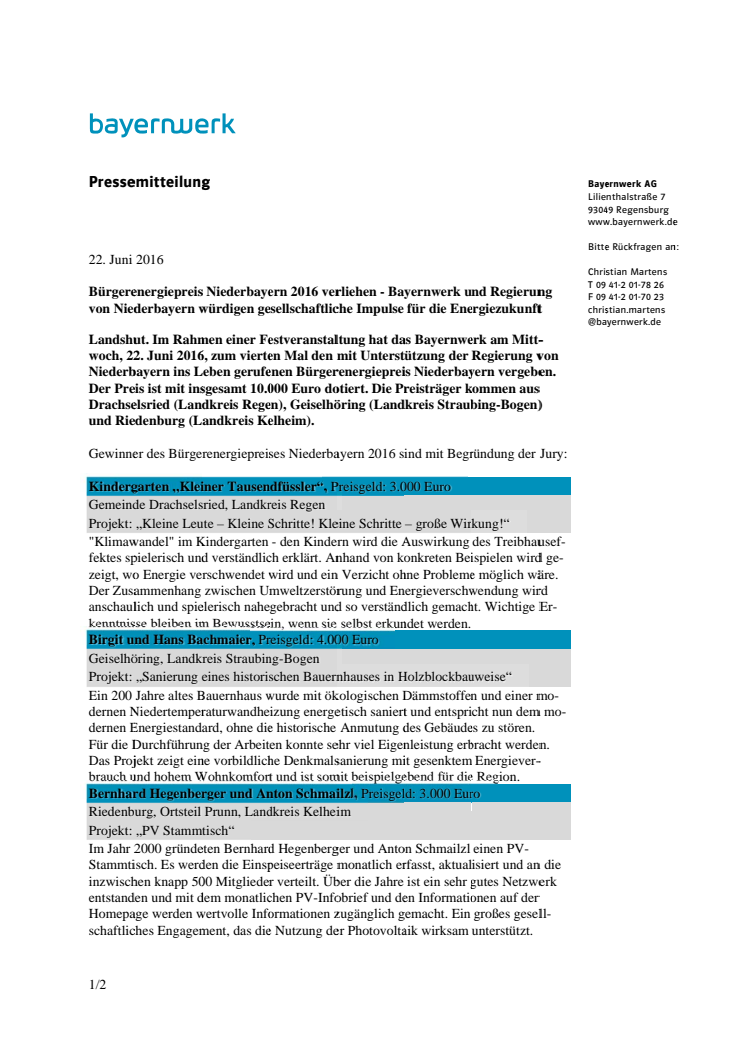 Landshut. Das Bayernwerk hat am Mittwoch, 22. Juni 2016, zum vierten Mal den mit Unterstützung der Regierung von Niederbayern ins Leben gerufenen Bürgerenergiepreis Niederbayern vergeben. Der Preis ist mit insgesamt 10.000 Euro dotiert. Die Preisträger kommen aus Drachselsried (Landkreis Regen), Geiselhöring (Landkreis Straubing-Bogen) und Riedenburg (Landkreis Kelheim).