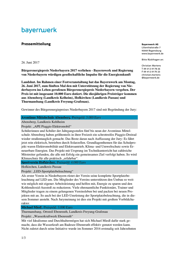Landshut. Im Rahmen einer Festveranstaltung hat das Bayernwerk am Montag, 26. Juni 2017, zum fünften Mal den mit Unterstützung der Regierung von Niederbayern ins Leben gerufenen Bürgerenergiepreis Niederbayern vergeben. Der Preis ist mit insgesamt 10.000 Euro dotiert. Die diesjährigen Preisträger kommen aus Abensberg (LK Kelheim), Hofkirchen (LK Passau) und Thurmansbang (LK Freyung-Grafenau).