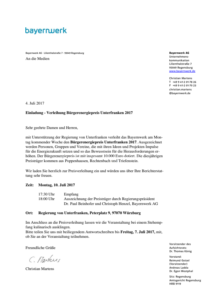 Würzburg. Im Rahmen einer Festveranstaltung hat das Bayernwerk am Montag, 10. Juli 2017, zum dritten Mal den mit Unterstützung der Regierung von Unterfranken ins Leben gerufenen Bürgerenergiepreis Unterfranken vergeben. Der Preis ist mit insgesamt 10.000 Euro dotiert. Die diesjährigen Preisträger kommen aus Rechtenbach, Triefenstein (beide Lk Main-Spessart) und Poppenhausen (Lk Schweinfurt).