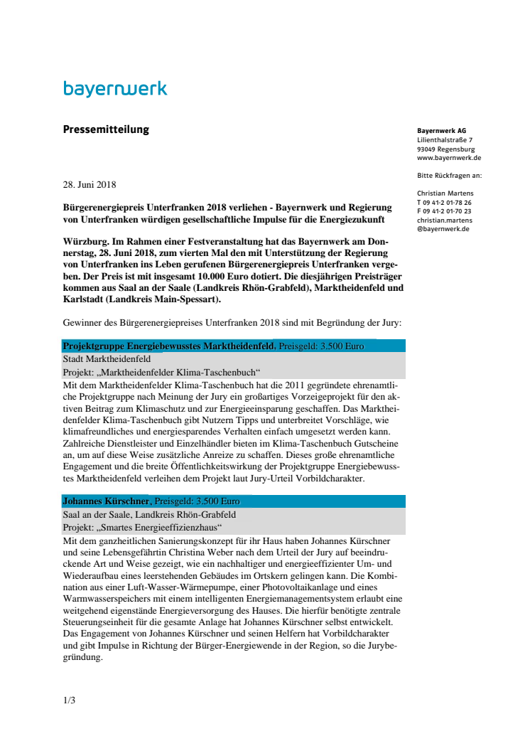Im Rahmen einer Festveranstaltung hat das Bayernwerk am Donnerstag, 28. Juni 2018, zum vierten Mal den mit Unterstützung der Regierung von Unterfranken ins Leben gerufenen Bürgerenergiepreis Unterfranken vergeben. Der Preis ist mit insgesamt 10.000 Euro dotiert. Die diesjährigen Preisträger kommen aus Saal an der Saale (Lk Rhön-Grabfeld), Marktheidenfeld und Karlstadt (Lk Main-Spessart).