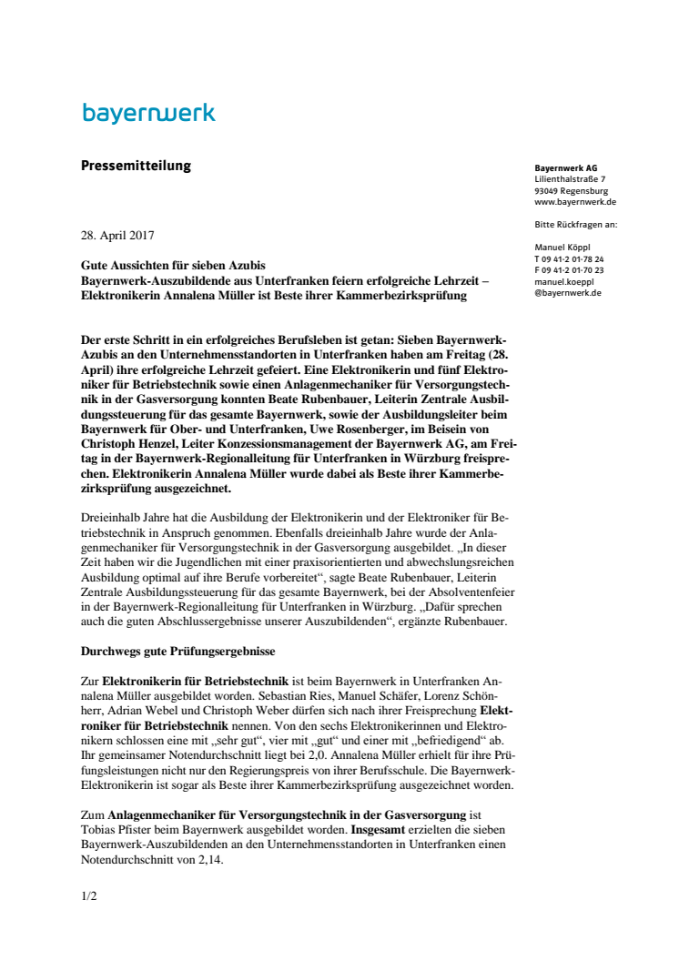 Bayernwerk-Auszubildende aus Unterfranken feiern erfolgreiche Lehrzeit – Elektronikerin Annalena Müller ist Beste ihrer Kammerbezirksprüfung