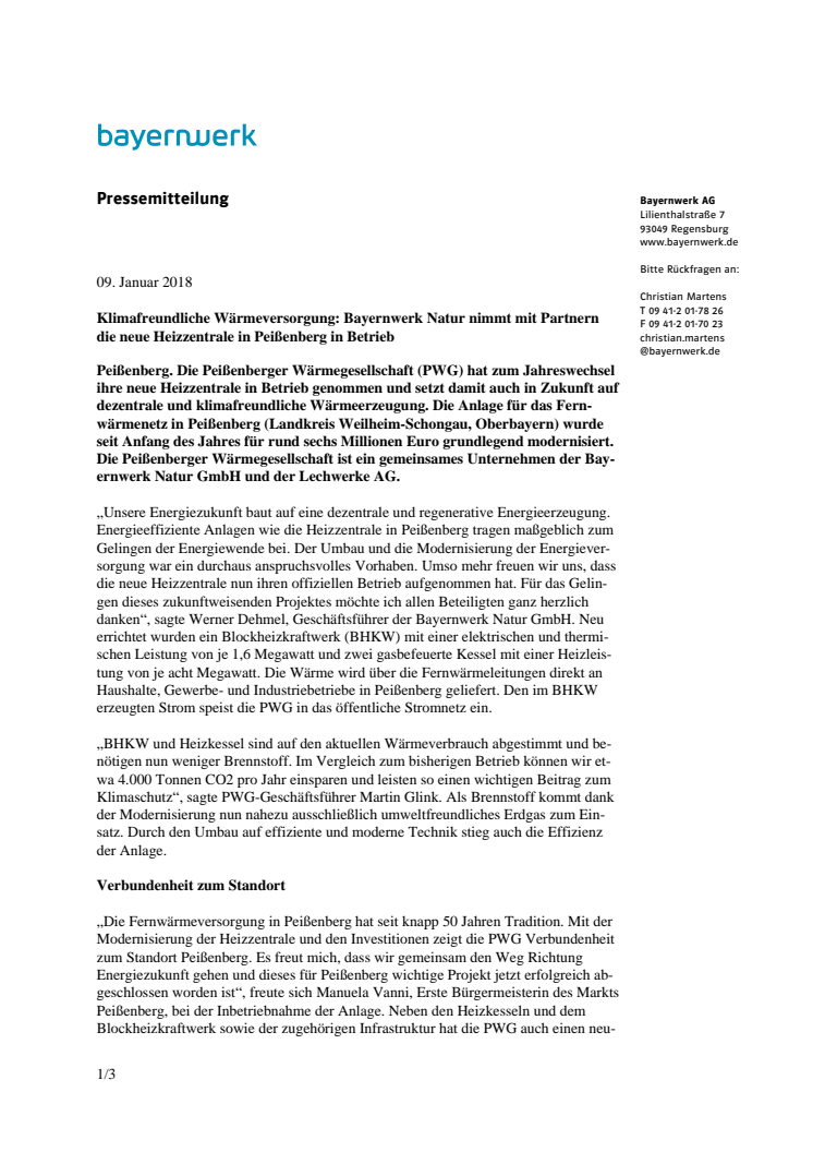 Die Peißenberger Wärmegesellschaft (PWG) hat zum Jahreswechsel ihre neue Heizzentrale in Betrieb genommen und setzt damit auch in Zukunft auf dezentrale und klimafreundliche Wärmeerzeugung. Die Anlage für das Fernwärmenetz in Peißenberg (Lk Weilheim-Schongau, Oberbayern) wurde für rund sechs Millionen Euro modernisiert. Die PWG ist ein Unternehmen der Bayernwerk Natur GmbH und der Lechwerke AG.